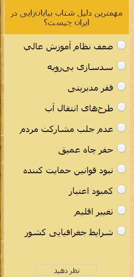سهم عواملی نظیر حفر چاه های غیر مجاز و تغییر اقلیم و ضعف مشارکت مردم از نظر من بسیار پایین برآورد شده