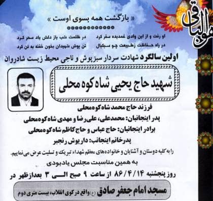 امروز به ياد نخستين سالگرد عروج خونين نود و پنجمين سردار سبزپوش طبيعت وطن، يحيي شاهكوه محلي عزيز، مجلس يادبودي در مسجد حضرت امام جعفر صادق (ع) گرگان برگزار است؛ محيطبان عاشقي كه در برابر گلوله ايستاد و رفت تا طبيعت زيباي وطن و زيستمندان ارزشمندش همچنان بماند … باشد كه قدر اين پيام سرخگون و اين خونهاي پاك را كه براي ماندگاري سبزينه بر اين خاك مقدس ريخته شده و ميشود، بيش از پيش بدانيم.
