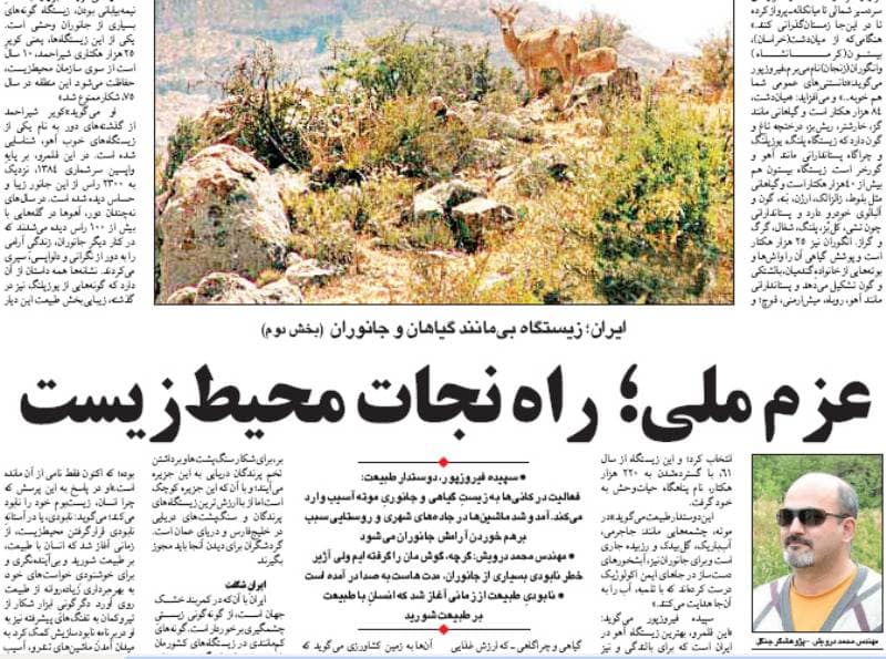 روزنامه اطلاعات از روز گذشته، انتشار يك مجموعه گزارش و گفتگو را شروع كرده با عنوان: «ايران؛ زيستگاه بي مانند گياهان و جانوران» كه تا فردا ادامه دارد. در اين سلسله گزارشها، ضمن گفتگو با برخي فعالان محيط زيستي، مانند استاد هوشنگ ضيايي، سپيده فيروزپور و نگارنده، كوشيده است تا مخاطبين خويش را با جلوههاي ناب و كمتر توجه شدهاي از طبيعت وطن آشنا و آگاه سازد.