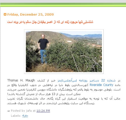 اشاره ایشان به خبر کشف یک گونهی گیاهی در ایالت کالیفرنیا آمریکا بود که بیش از 13 هزار سال قدمت داشت و در روز 22 دسامبر (5 روز پیش) در درگاه مجازی روزنامه لسآنجلستایمز منتشر شده بود. من نیز برگردان مختصری از آن خبر را در مهاربیابانزایی بازانتشار دادم.