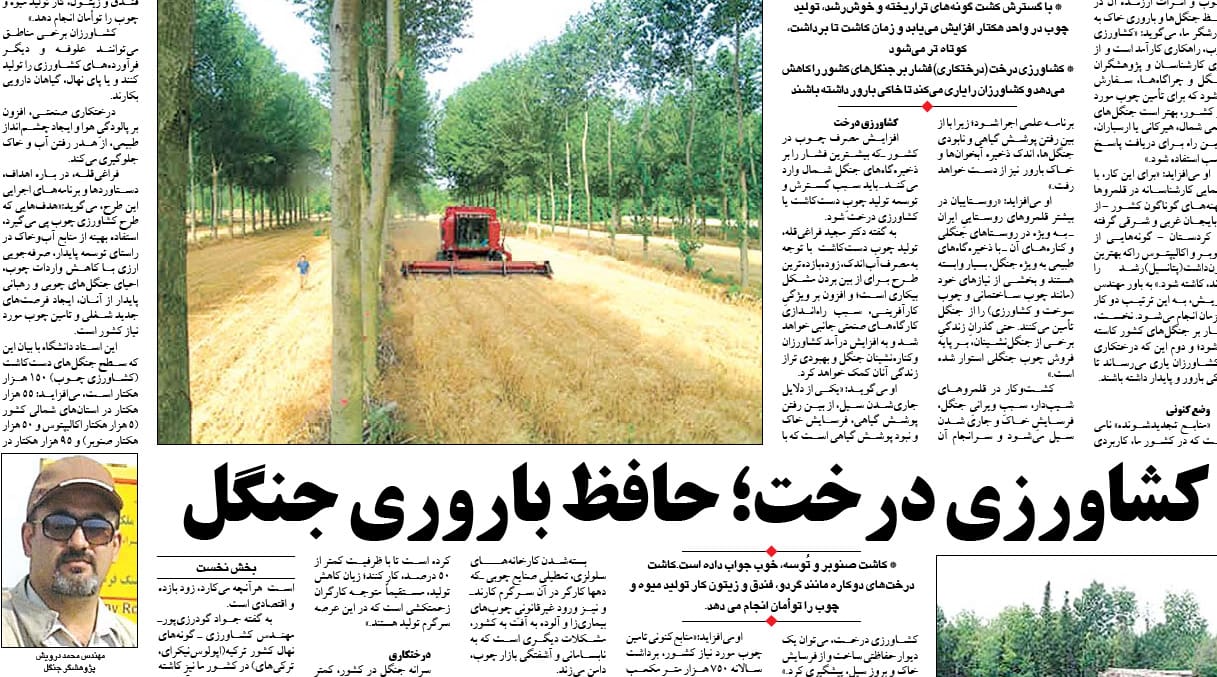 خبرنگار سختکوش و با سابقهی روزنامهی 84 سالهی اطلاعات، آقای علی درویشی، گزارش مفصلی در بارهی زراعت چوب در ایران تهیه کرده است که بخش نخست آن دیروز در صفحه 5 از شماره 24696 روزنامه اطلاعات منتشر شد.