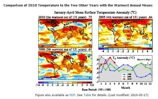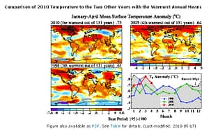 همان گونه که سال 2009 رکورد گرمترین سال جهان را شکست، اینک بررسیهای انجام شده توسط ناسا در طول 4 ماههی نخست سال 2010 نشان میدهد که در طول 131 سال گذشته، هرگز چنین گرمایی را کرهی زمین درک نکرده بوده است!