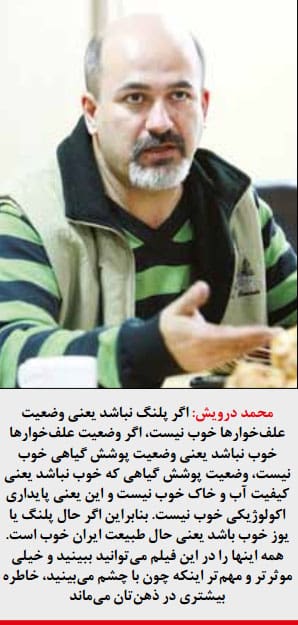 درویش: وقتی سوژه در دسترس بیشتر باشد، جذابیتش هم بیشتر است ولی متاسفانه این مساله رایج است که ما هنوز در وظایف سازمانی منابع طبیعی و محیطزیست این ایده را وارد نکردیم که از مهمترین کارهایی که میتواند به ظرفیتسازی در حوزه محیطزیست کمک کند و حساسیت مردم را نسبت به محیطزیست افزایش دهد، اتفاقا ارائه کارهای جذاب تصویری است. این کار خیلی بیشتر از برگزاری چندین همایش و ارائه چندین جلد ژورنال و کتاب میتواند موثر باشد. همین فیلم آقای امیری را در سالن سینما دیدم. اکثر مردمی که در سالن بودند، بعد از پایان فیلم چشمشان خیس بود. حالا شما ساعتها درباره پلنگ بنویسید. چقدر تاثیر دارد؟ هر چقدر بگویید که اگر پلنگ نباشد یعنی حال حیات وحش ایران خوب نیست، اگر پلنگ نباشد یعنی وضعیت علفخوارها خوب نیست، اگر وضعیت علفخوارها خوب نباشد یعنی وضعیت پوشش گیاهی خوب نیست، وضعیت پوشش گیاهی که خوب نباشد یعنی کیفیت آب و خاک خوب نیست. و این یعنی پایداری اکولوژیکی خوب نیست. بنابراین اگر حال پلنگ یا یوز خوب باشد یعنی حال طبیعت ایران خوب است. همه اینها را در این فیلم میتوانید ببینید و خیلی موثرتر و مهمتر اینکه چون با چشم میبینید، خاطره بیشتری در ذهنتان میماند.